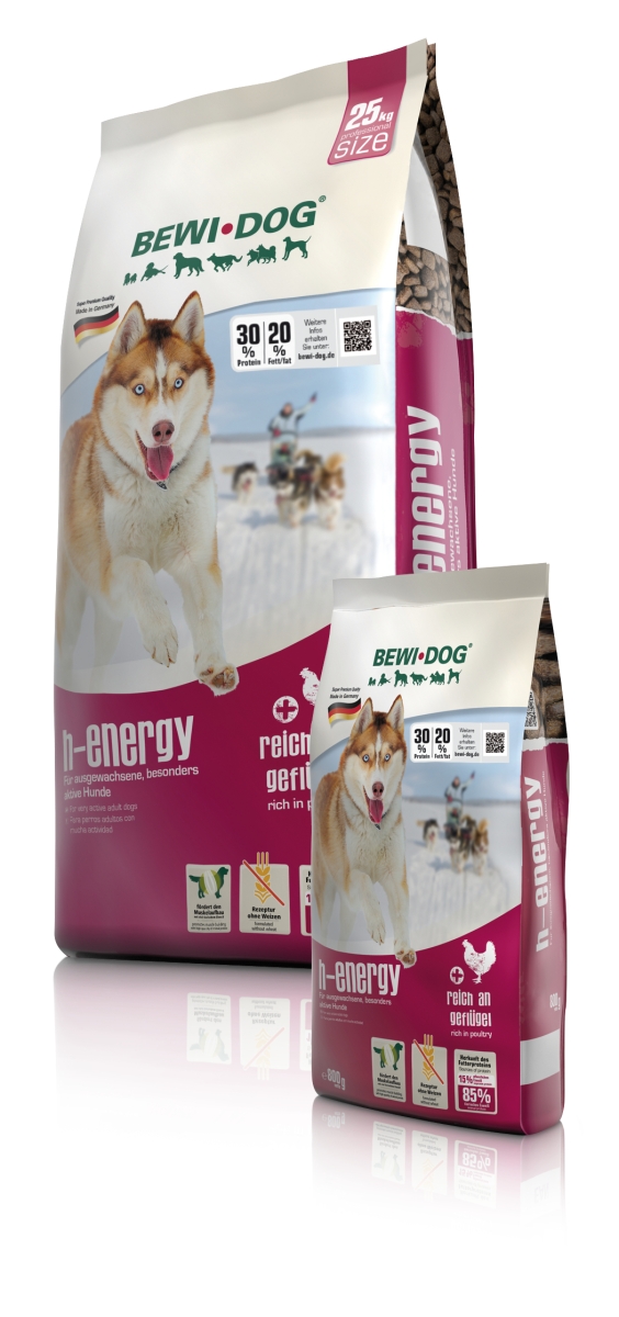 BEWI DOG® h-energy zeichnet sich durch hochverdauliche Fleischkomponenten und eine optimale Eiweißqualität aus. In Verbindung mit einem hohen Gehalt an speziellen, sehr gut verträglichen Fetten wird so dem besonderen Energie- und Eiweißbedarf von sehr aktiven Sporthunden oder auch von Zuchthündinnen entsprochen. Lecithin, Bierhefe, essenzielle Fettsäuren und eine reichhaltige Ausstattung mit Vitaminen, die im Leistungsstress in besonderem Maße benötigt werden, sind weitere Komponenten des einzigartigen BEWI DOG® Vitalkomplexes. Dieser liefert dem Leistungshund eine sinnvolle Nährstoffergänzung, die weit über ein gewöhnliches Futter hinausgeht.