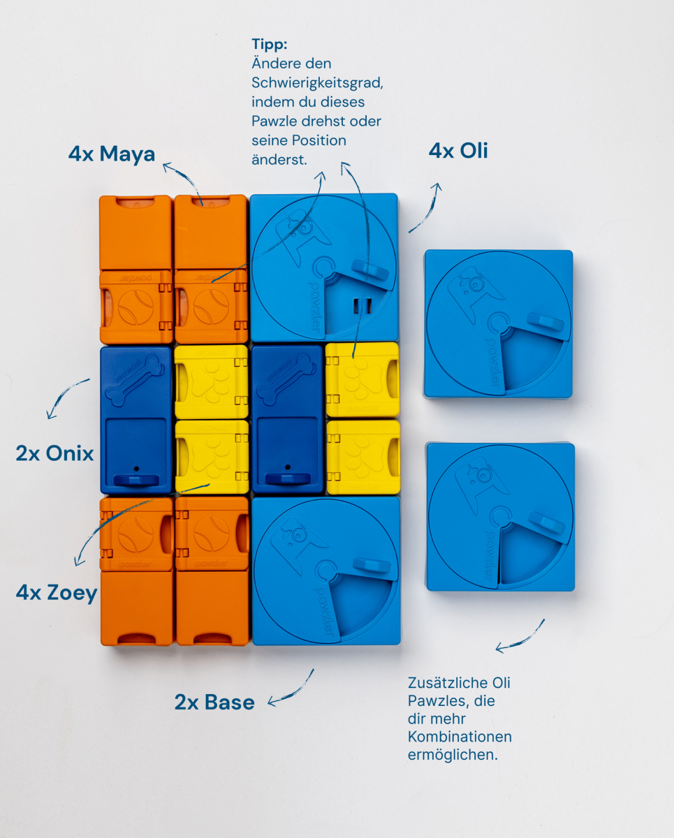Tipp: Indem du die gelben und orangenen Pawzles (Maya und Zoey) in verschiedene Richtungen drehst kannst du die Schwierigkeit des Spielzeugs ändern!