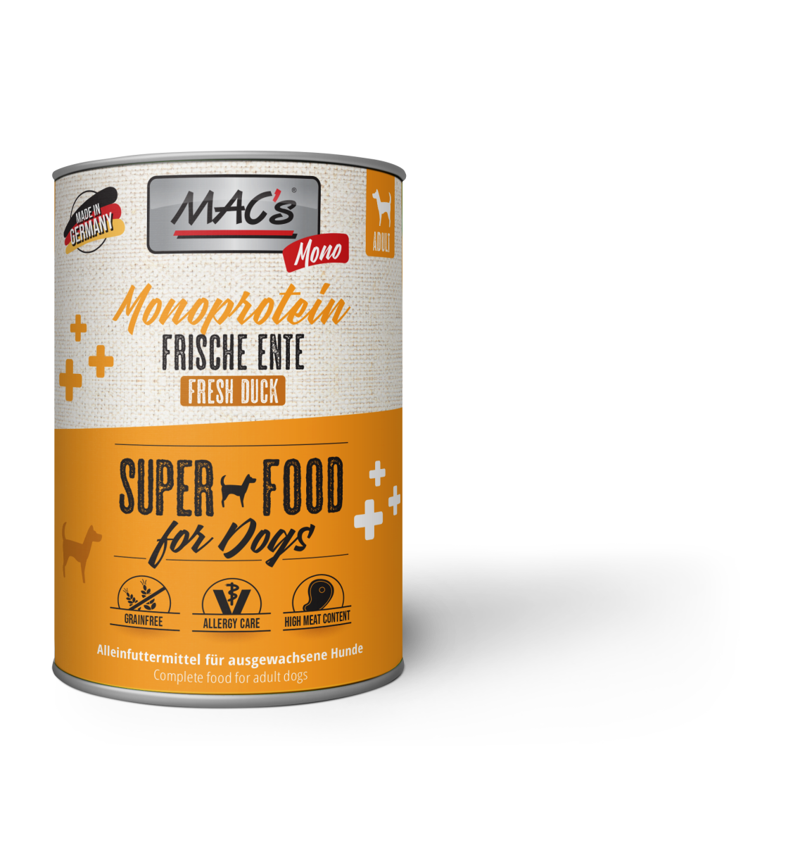 Ausgewogen und mit nur einer tierischen Proteinquelle bietet MAC’s Mono Frische Ente deinem Vierbeiner alles, was er für ein glückliches Hundeleben benötigt. Dieses Menü ist ideal für Hunde, die auf andere Proteinquellen empfindlich reagieren. Mit Kartoffeln als Quelle für Kohlenhydrate und Erbsen als pflanzliche Proteinlieferanten – natürlich getreidefrei, weil dein Liebling nur das Beste verdient!