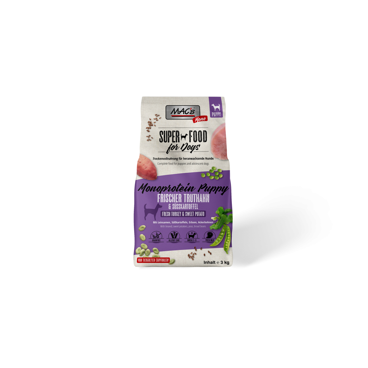 De perfecte maaltijd voor puppy's: MAC's Mono Fresh Turkey & Sweet Potato is speciaal samengesteld om te voldoen aan de behoeften van opgroeiende puppy's en jonge honden. Met slechts één dierlijke eiwitbron en de combinatie van vers vlees, fruit en groenten is dit menu bijzonder geschikt voor gevoelige puppy's en puppy's die gevoelig zijn voor allergieën. Deze variëteit voorziet je kleine beschermeling van alle belangrijke vitaminen en mineralen die hij nodig heeft voor een optimale groei. Vooral glucosamine en chondroïtine kunnen de gezonde ontwikkeling van gewrichten en botten ondersteunen. Zodat je nieuwe gezinslid zorgeloos kan ravotten, spelen en opgroeien.