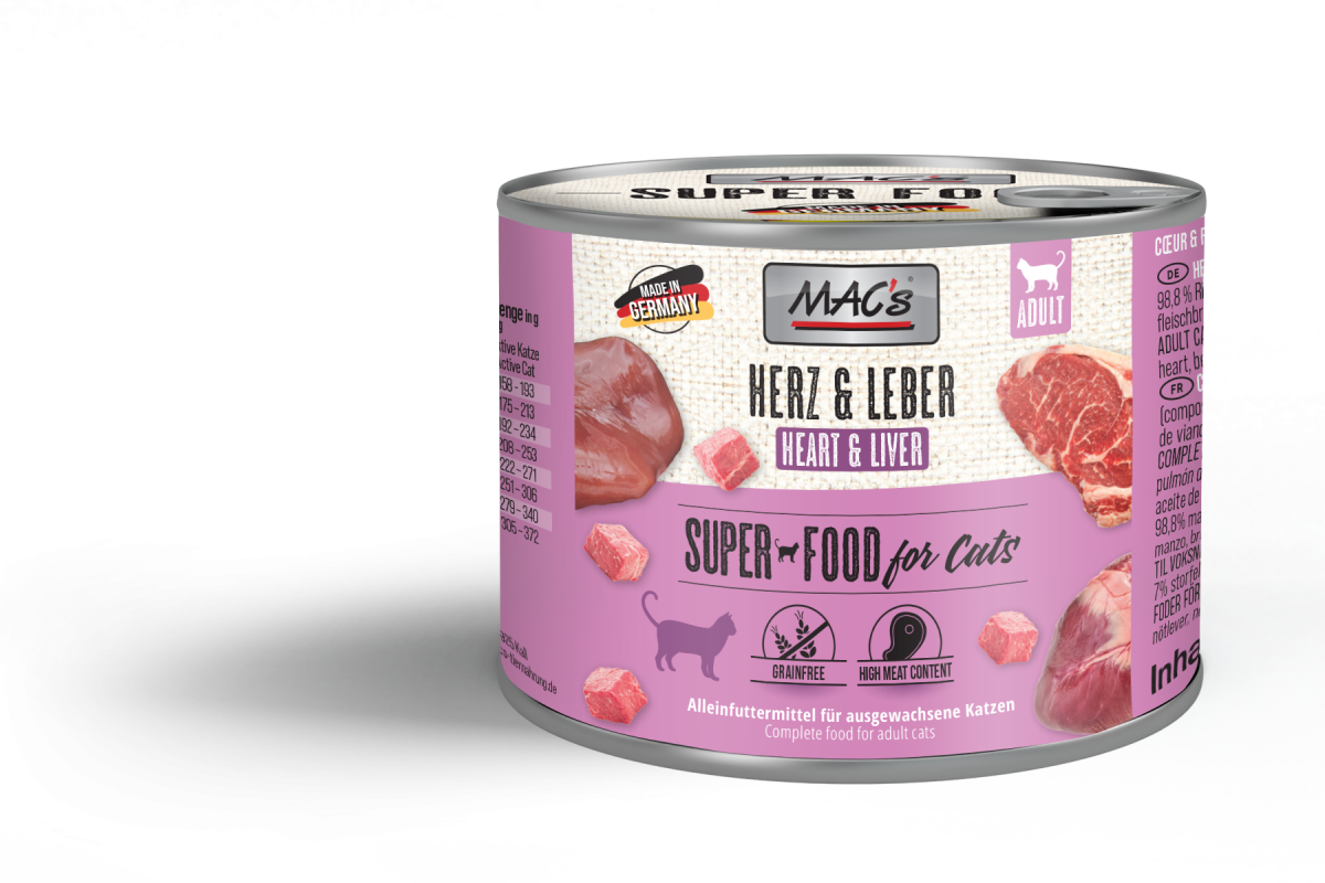 Ein echtes Festmahl für kleine Fleischliebhaber: MAC’s Herz & Leber liefert deiner Katze hochwertige Proteine und wertvolle Vitamine. Leber bietet ein exquisites Geschmackserlebnis voller Nährstoffe. Das enthaltene Nachtkerzenöl ist besonders reich an mehrfach ungesättigten Fettsäuren, welche eine gesunde Haut und ein glänzendes Fell unterstützen können. Natürlich getreidefrei – für deine Katze nur das Beste im Napf!