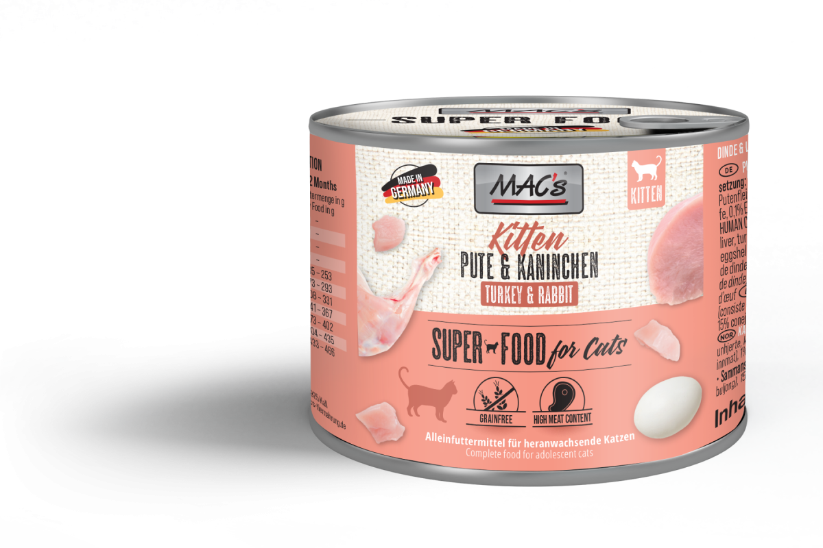 MAC’s Kitten Pute & Kaninchen wurde entwickelt, um deiner kleinen Samtpfote den besten Start ins Leben zu ermöglichen. Mit viel frischem Fleisch und einem angepassten Aminosäureprofil liefert diese Sorte deinem Kitten wichtige Vitamine und Mineralstoffe, die es für ein gesundes Wachstum braucht. Die getreidefreie Rezeptur wurde extra auf heranwachsende Katzen angepasst. Sie enthält Eierschalenpulver als natürliche Calciumquelle, was die gesunde Entwicklung starker Knochen und Zähne fördern kann.