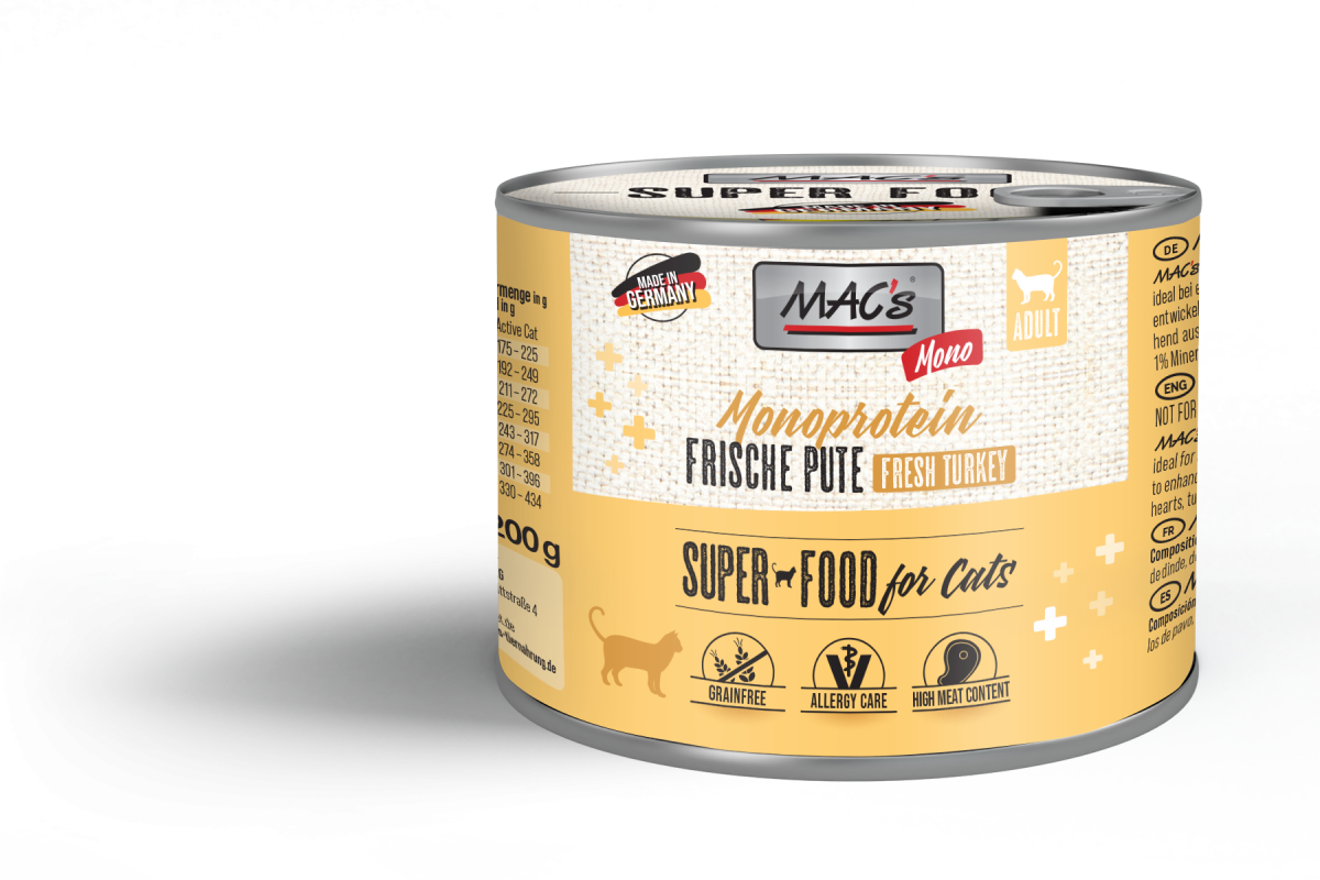 Ideaal voor gevoelige katten: MAC’s Mono Kalkoen is gebaseerd op één dierlijke eiwitbron. Het graanvrije recept bevat een hoog aandeel spiervlees en hoogwaardige organen – ideaal voor katten die gevoelig reageren op andere eiwitbronnen.