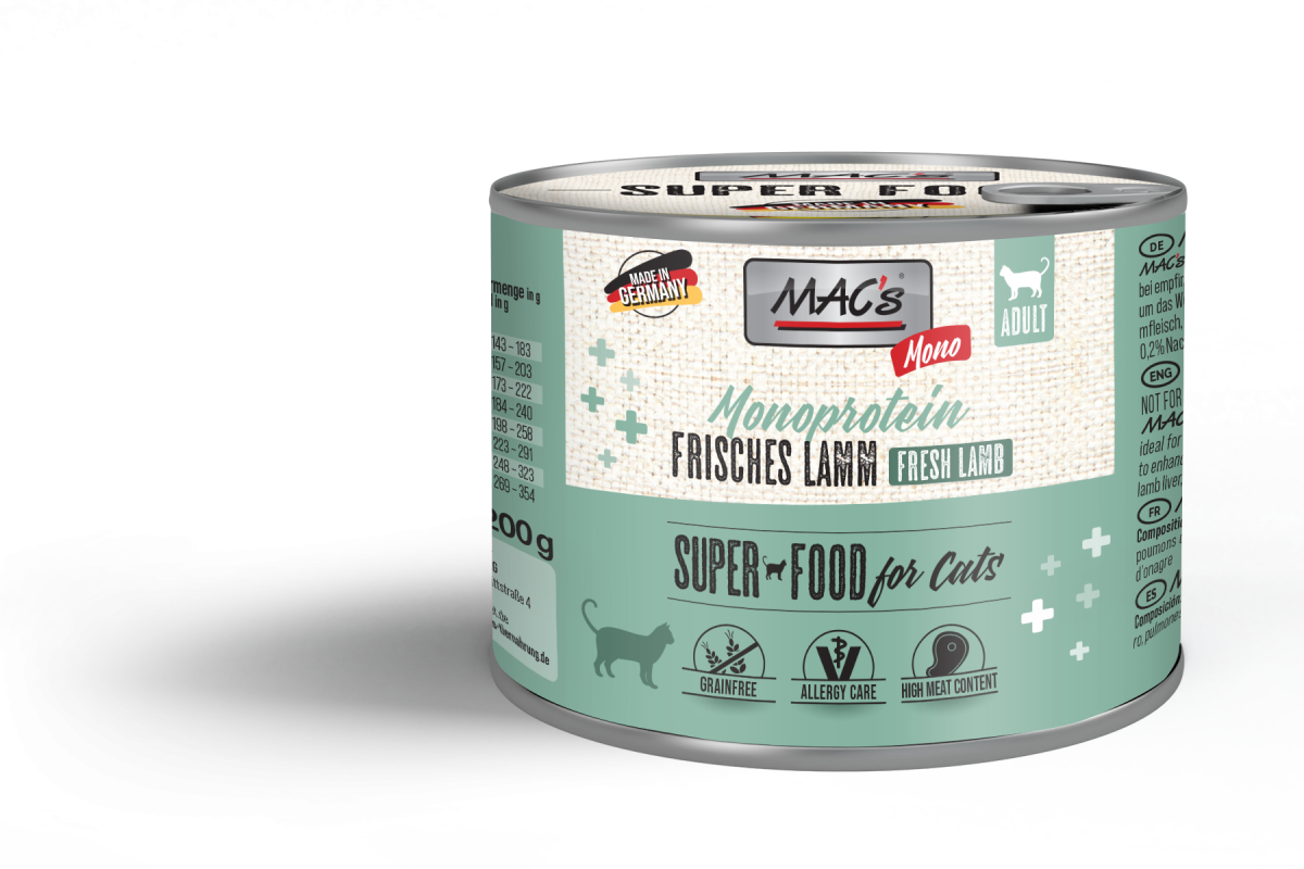 Ideal für empfindliche Katzen: MAC's MONO Lamm basiert auf einer einzigen tierischen Proteinquelle. Die getreidefreie Rezeptur enthält einen hohen Anteil an Muskelfleisch sowie hochwertigen Innereien – ideal für Katzen, die auf andere Proteinquellen empfindlich reagieren.